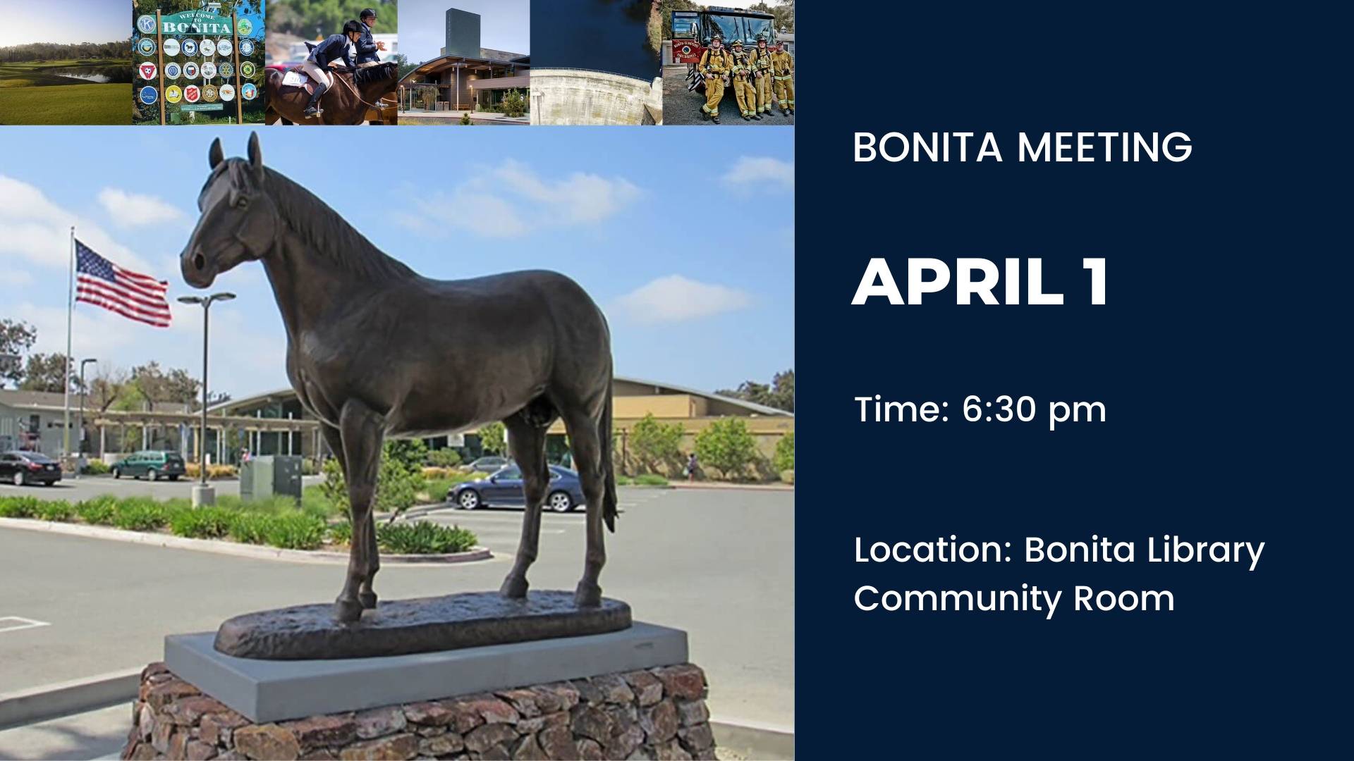 Our upcoming meeting is on Wednesday, April 1, at the Bonita-Sunnyside Library Community Room. Please review the agenda and plan to attend.