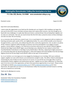 Click the image below to read the President’s Letter from the new Sweetwater Valley Civic Association President, Felix M. Felix